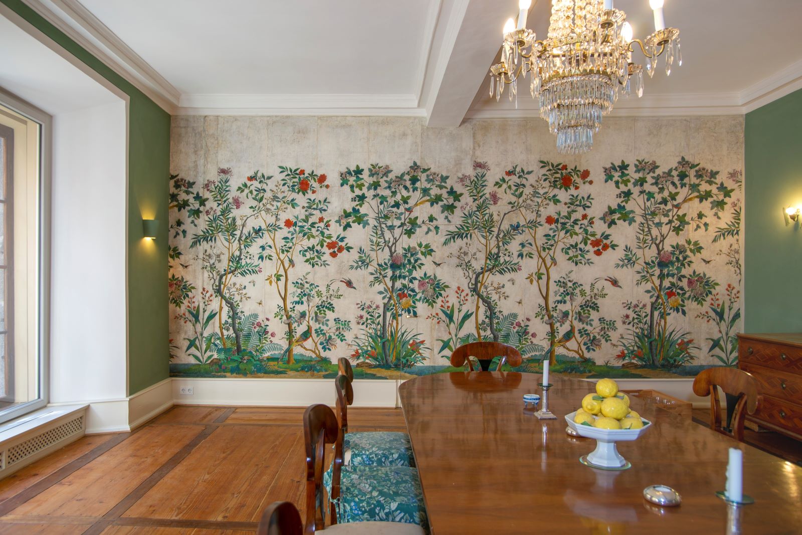 Im 1. Obergeschoss wurden die letzten noch erhaltenen bemalten Tapeten aus dem 19. Jahrhundert am Gebäude restauriert. Die Tapete stammt nach erfolgter Untersuchung aus der französischen Manufaktur Jean Zuber & Co., Rixheim. Die Druckstöcke dieser Tapete, welche heute zu den „monuments historiques“ in Frankreich gehören, wurden ab 1832 gefertigt.